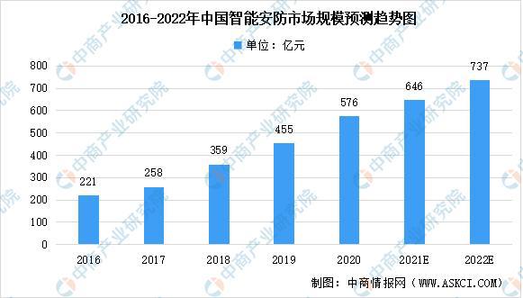 隨著城市智能化的進(jìn)程不斷推進(jìn),我國安防行業(yè)的市場需求逐漸被激發(fā)。智慧安防主要是通過視頻監(jiān)控、傳感器等基礎(chǔ)設(shè)備將關(guān)鍵信息傳輸?shù)骄C合系統(tǒng)上,再由綜合系統(tǒng)分析信息數(shù)據(jù),進(jìn)行信息反饋,以便實(shí)現(xiàn)能夠動(dòng)態(tài)實(shí)時(shí)的監(jiān)控,進(jìn)一步實(shí)現(xiàn)預(yù)測威脅并及時(shí)響應(yīng)的目的。2019年我國智能安防市場規(guī)模為455億元,2016-2019年年均復(fù)合增長率為27.22%,中商產(chǎn)業(yè)研究院預(yù)測,2022年我國智能安防市場規(guī)模達(dá)737億元。